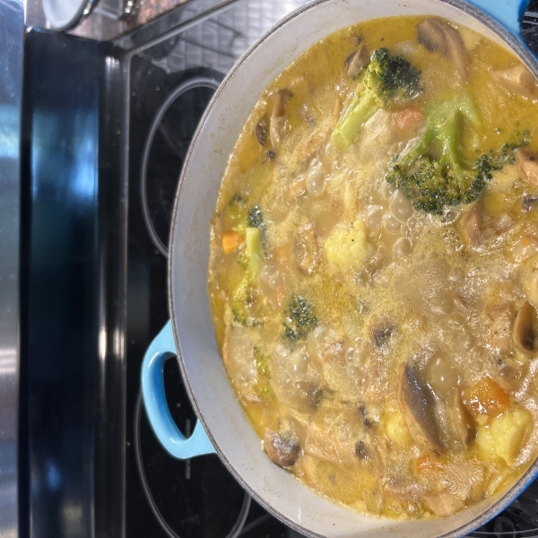 Add broccoli, cauliflower, mushrooms, and water; simmer, covered, until all vegetables are tender, about 5 minutes.