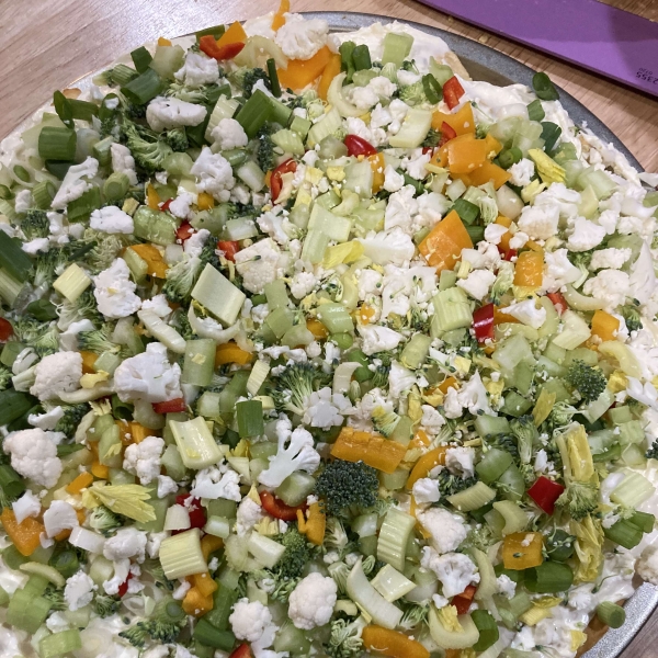 Arrange broccoli, tomatoes, bell pepper, cauliflower, shredded carrots, and Cheddar cheese over the cream cheese layer.