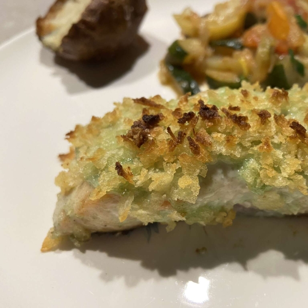 This spicy wasabi salmon fillet topped with crushed potato chips can be grilled, smoked with apple chips, or roasted in the oven.