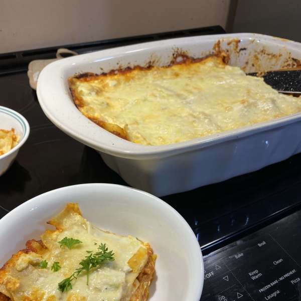 Bake in the preheated oven for 25 minutes. Remove the foil and bake for an additional 25 minutes. Rest lasagna for 15 minutes before serving.