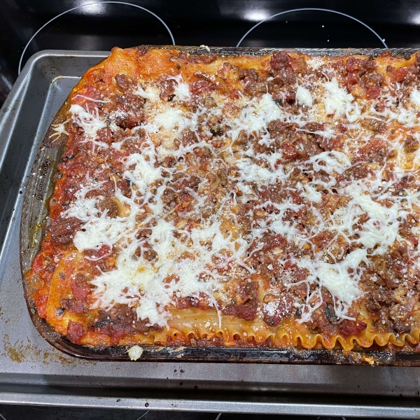 This lasagna recipe is made with layers of homemade meat sauce, tender pasta sheets, ricotta filling, and lots of Parmesan and mozzarella cheese.