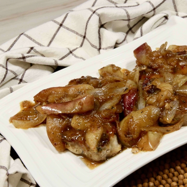 Cook and stir onion in the oil and drippings retained in the skillet until tender, about 3 minutes; add apple slices and continue cooking until the apple slices are tender, about 2 minutes. Pour apple juice over the onion and apple mixture; add brown sugar and remaining flour mixture and stir to dissolve.
