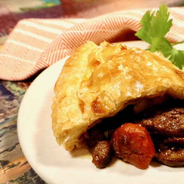 Spread the filling into a 9-inch pie dish; trim the puff pastry into a 10-inch circle, and place on top of the filling. Pinch and crimp the edges of the pastry with a fork, sealing it to the dish; cut 2 steam vents into the pastry with a sharp knife. Brush the top of the pie with beaten egg.