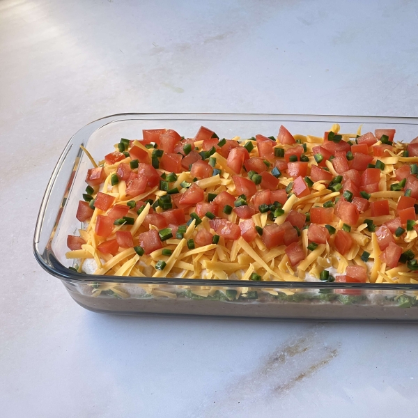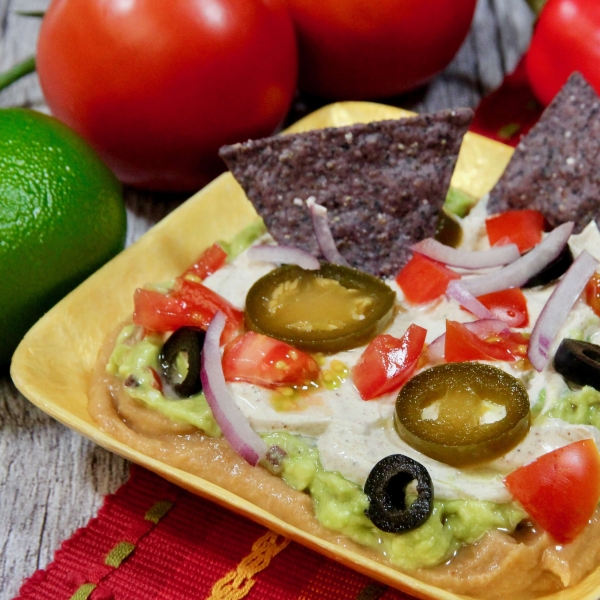 This best ever layered Mexican dip has beans, guacamole, taco-seasoned sour cream, tomatoes, cheese, and diced jalapeños for a burst of heat.
