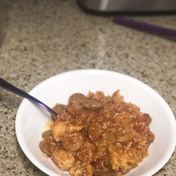 A spicy jambalaya with chicken, andouille sausage, rice and Cajun seasonings that's easy to make in one pot.