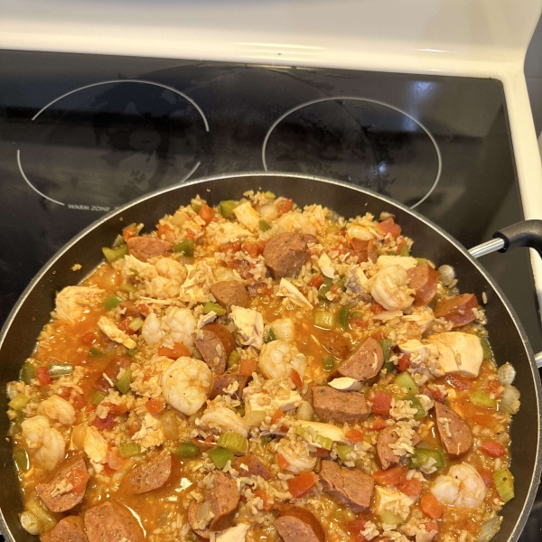 A spicy jambalaya with chicken, andouille sausage, rice and Cajun seasonings that's easy to make in one pot.