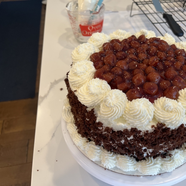 To assemble, place one cake layer on a cake plate. Spread with 1 cup frosting; top with 3/4 cup cherry topping. Top with second cake layer; repeat layers of frosting and cherry topping. Top with third cake layer and frost sides of cake.
