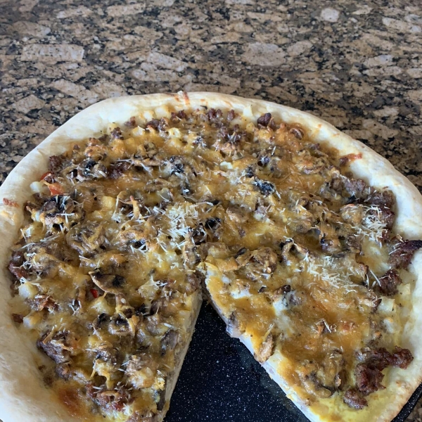 Breakfast pizza is an easy crowd-pleaser. A crust made from crescent-roll dough is topped with morning favorites: eggs, sausage, and hash browns.