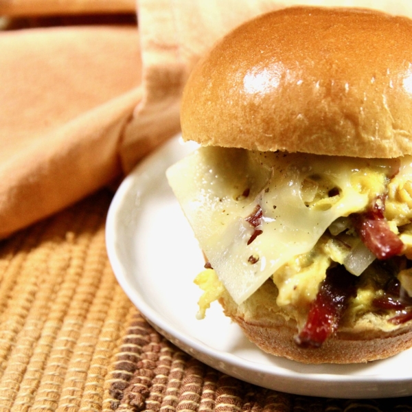 Evenly portion out egg mixture over the bottom halves of the slider buns, add a piece of Swiss cheese, season with salt and pepper, and add the top halves of the buns. Serve warm.