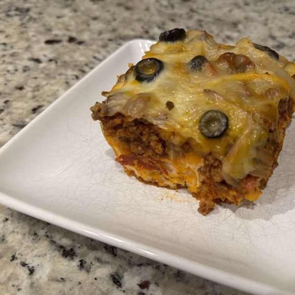 This bubble pizza uses store-bought biscuit dough for the crust and features a topping of ground beef, pepperoni, olives, mushrooms, and pizza sauce.