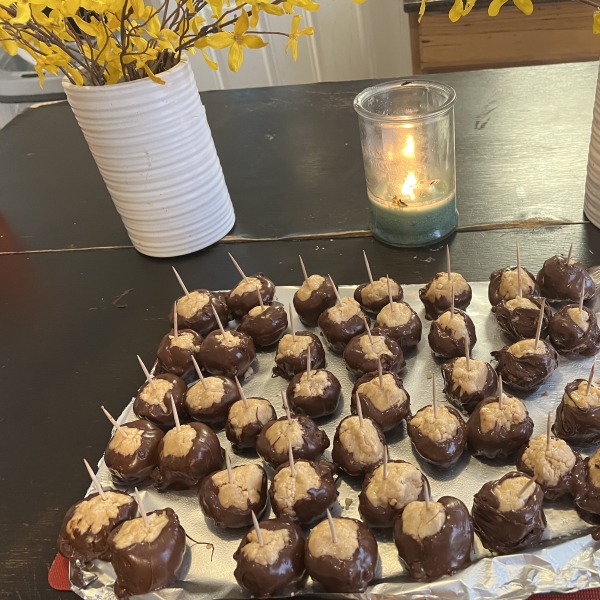 Hold the toothpicks and dip frozen peanut butter balls into the melted chocolate, leaving a small portion of peanut butter showing at the top. Return to the cookie sheet, remove and discard the toothpicks, and refrigerate until ready to serve.