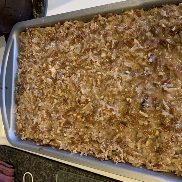 When cake comes out of the oven, pour on the topping and carefully spread on while cake is still hot.