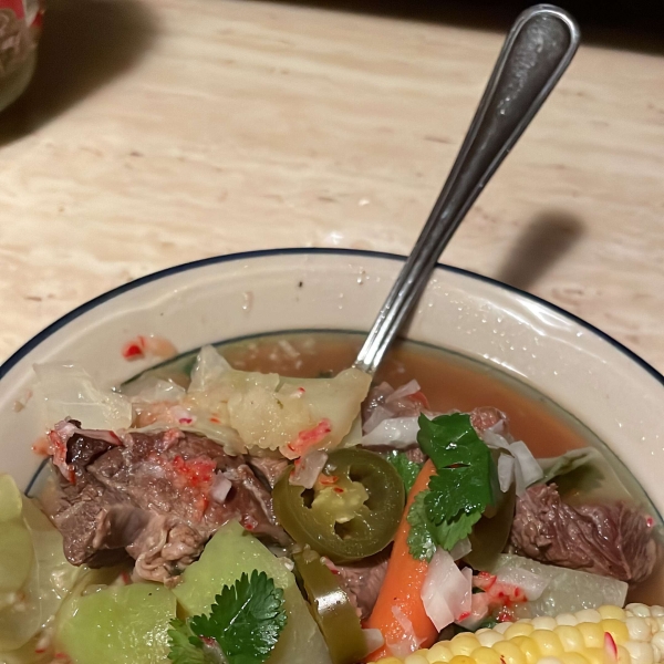 Ladle soup into large bowls, including some meat, vegetables, and bones. Garnish with cilantro, jalapeños, and minced onion. Squeeze lime juice over soup and serve with radishes.