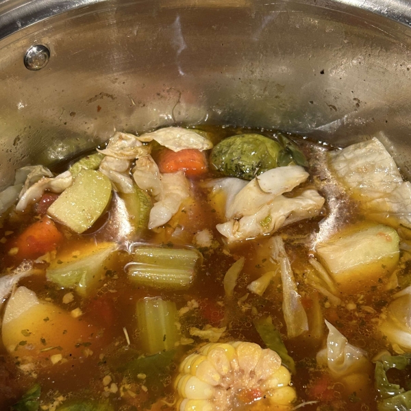 Pour in 4 cups water, and return to a simmer. Add carrots and 1/4 cup cilantro, and cook for 10 minutes. Stir in chayote, corn, and potato; simmer until vegetables are tender. Push cabbage wedges into soup; cook until tender, about 10 minutes.