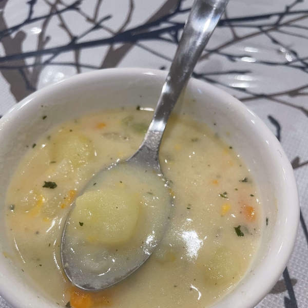 Cooked vegetables and cheddar cheese are added to a roux-thickened milk base in this comforting soup.