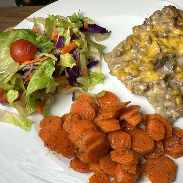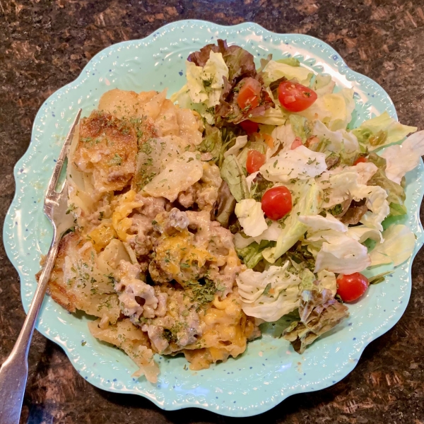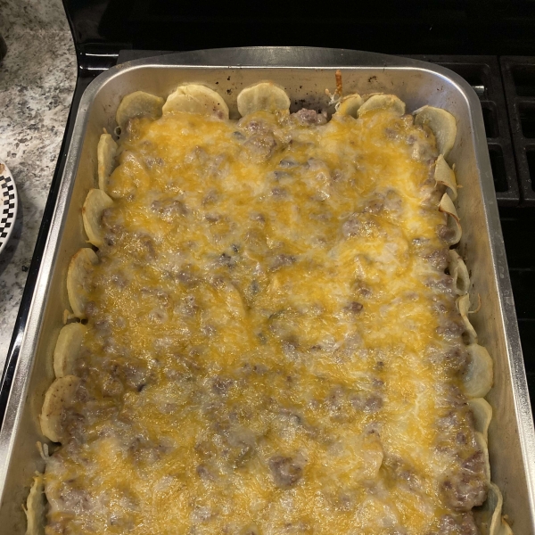 This ground beef and potatoes recipe combines buttery sliced potatoes topped with a cheesy ground beef mixture. Pure comfort food!