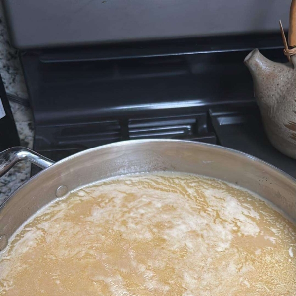 Place the roasting pan over a stovetop burner set to medium heat. Pour 2 tablespoons cold water into the pan and bring to a boil, scraping up any browned bits.