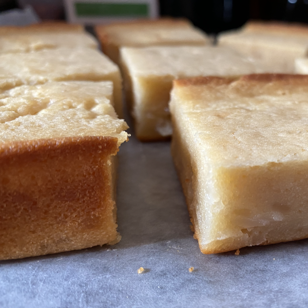 A very coconutty and chewy Flilipino rice flour dessert. Traditionally, this is baked in banana leaves.