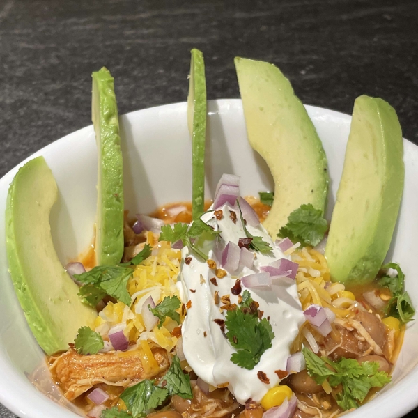 This chicken and corn chili is simmered in a slow cooker with pinto beans and flavored with salsa, cumin, and chili powder for a comforting dish.