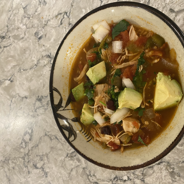 Remove chicken and shred with two forks. Return chicken to soup. Ladle into individual bowls and top with crushed tortilla chips.
