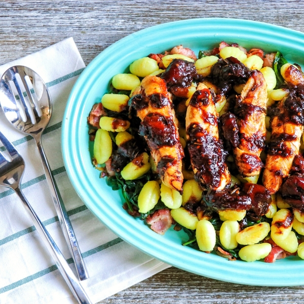 Place bacon and onion onto a serving plate and top with spinach, gnocchi, and chicken, in that order. Drizzle with tomato-balsamic sauce.