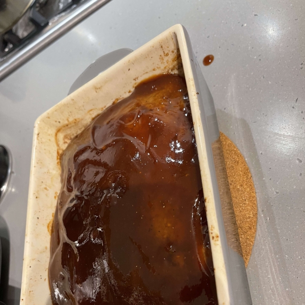 Remove meatloaf from the oven. Spoon glaze on the top of the meatloaf with the back of a spoon, then pull a tiny bit glaze down the sides.