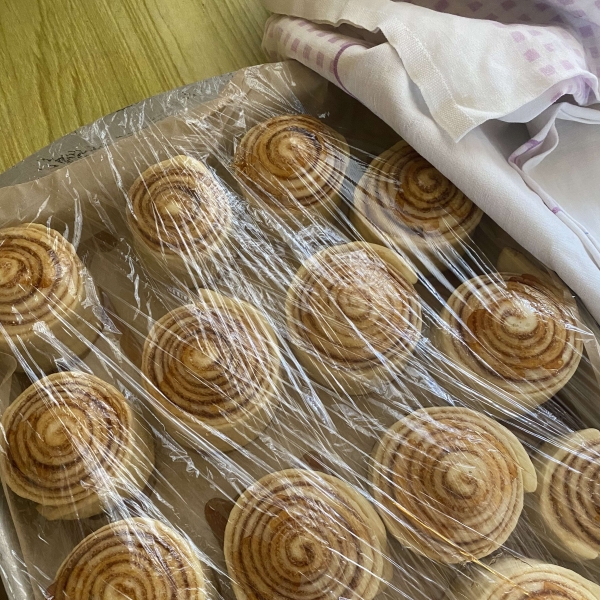 Starting at the longer end, roll up the dough; cut into 12 rolls. Place rolls in a lightly greased 9x13-inch baking pan. Cover and let rise until nearly doubled, about 30 minutes.