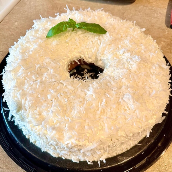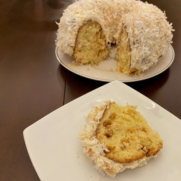 This coconut Bundt cake recipe features a rich cream cheese frosting and shredded coconut on top.