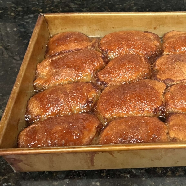 Melt butter in a small saucepan over low heat. Stir sugar and cinnamon into melted butter until combined. Pour over apple dumplings, followed by soda.