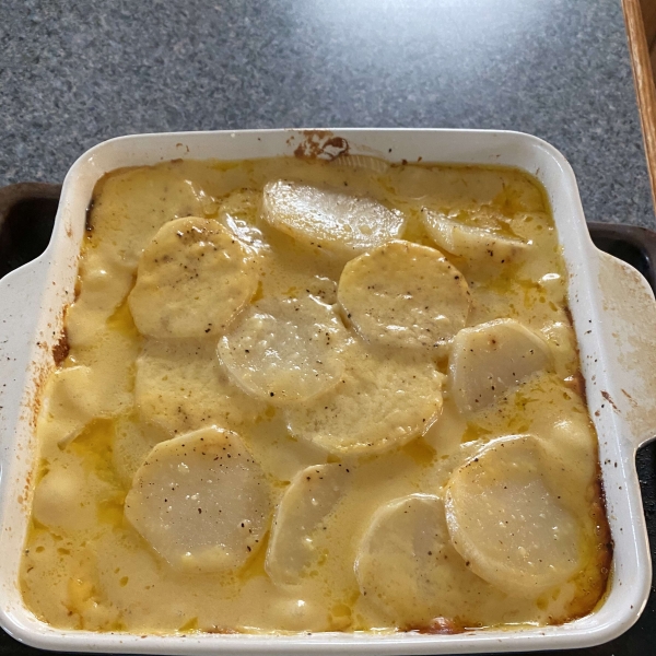 This favorite recipe for au gratin potatoes pairs thinly sliced russet potatoes and onions in a decadently rich and creamy Cheddar cheese sauce.