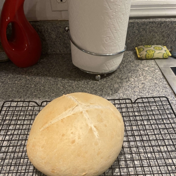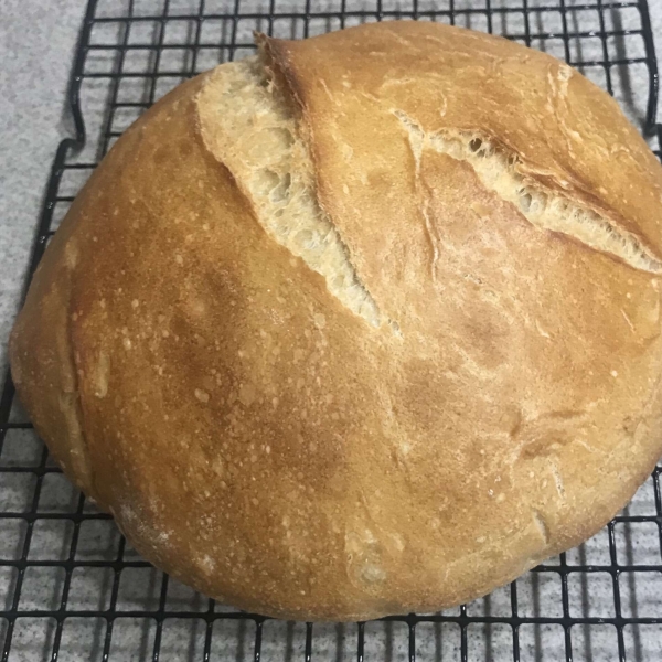 Baked crisp and golden in a Dutch oven, this easy white bread loaf requires simple ingredients and preparation.