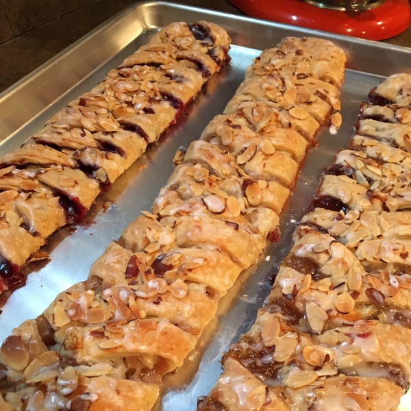 This Danish kringle is a wonderful holiday pastry treat that is both beautiful and delicious. The recipe is from my father-in-law's mother who was born and raised in Denmark. It looks like a complicated braid but is simply created by crisscrossing strips of dough. Plan to make your dough at least 1 to 2 days in advance — it's easy to make and doesn't require yeast. Creating the kringle takes more time, but it is worth it!