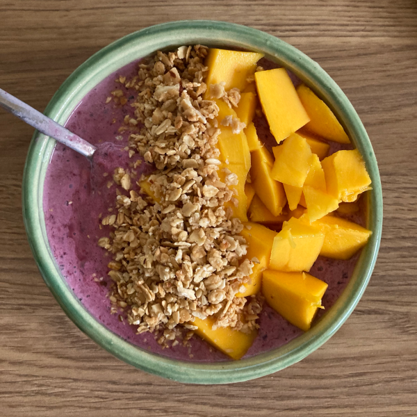 This is a delicious breakfast smoothie bowl. My kids like it so I sweeten it with honey, but you can use agave as well for a vegan version or not sweeten it at all. Top the smoothie bowls with some granola for crunch, nuts, or other berries of your choosing.
