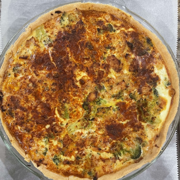 This ham and broccoli quiche with Cheddar and onion features a milk and egg custard baked in a tender crust for a delicious meal any time of day.