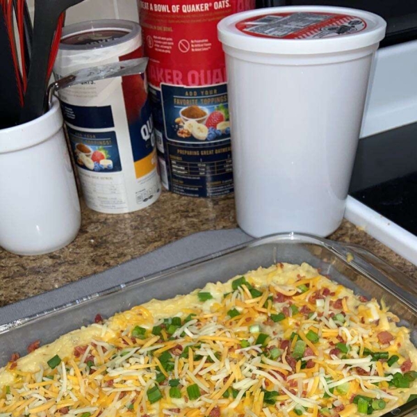 This baked potato casserole features creamy mashed potatoes loaded with Cheddar cheese, bacon, sour cream, and green onions for a comforting side dish.