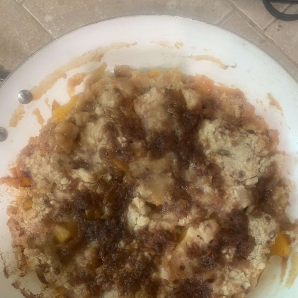 Discard 1/2 of the juice from canned peaches and pour peaches with remaining juice into a large saucepan. Sprinkle with sugar and cinnamon. Cover with cake mix in an even layer. Place margarine on top in the center.