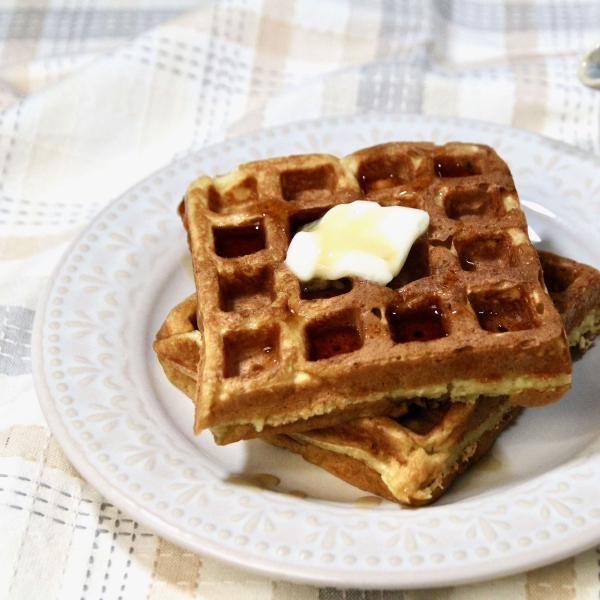 Preheat a waffle iron according to manufacturer's instructions. Pour 1/4 of the batter into the preheated iron and cook until waffle is crisp and golden, about 5 minutes. Repeat with remaining batter.