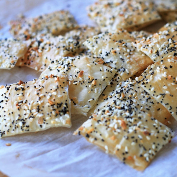 These phyllo crackers have a delicate, flaky texture with a buttery flavor. Bagel seasoning can be found at most major retailers or you can make your own. These can be a little finicky to make at first, but once you get the hang of it, you will be hooked!
