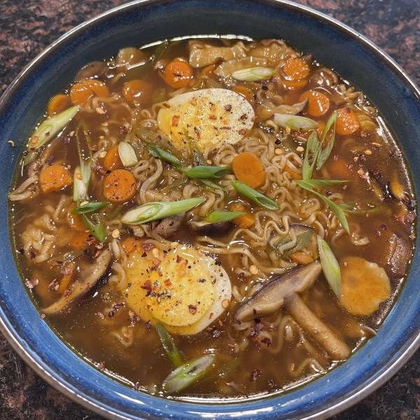 Combine water, mushrooms, 1/2 the green onions, carrot, onion, soy sauce, garlic, Sriracha sauce, sesame oil, rice wine vinegar, white pepper, black pepper, and flavor packets from ramen in a large pot. Bring to a boil. Add noodles and cook, occasionally stirring, until noodles are tender yet firm to the bite, about 5 minutes.