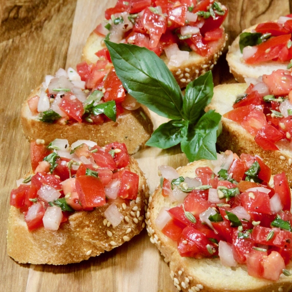 French bread slices, brushed with olive oil and toasted until golden brown, get a flavorful topping of fresh tomato, basil, and fennel seeds for a perfect summer appetizer or light lunch.