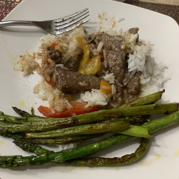 A beef stir-fry that has wonderful flavors without using a ton of spices. Fresh ginger mixes will with the soy sauce and makes a quick and easy sauce. Lots of veggies add color and crunch.