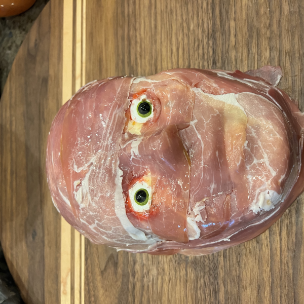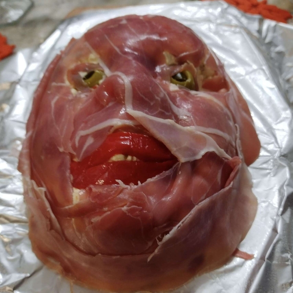 Invert the mask onto a serving platter and gently remove the mask and plastic wrap. You should be left with a gorgeous (and freaky) face. If there is cheese showing around the bottom edges, use the reserved prosciutto slices to cover it before serving.