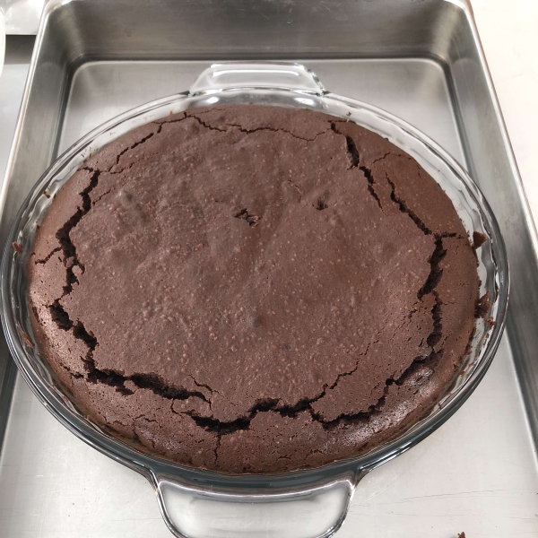 Pour batter into the prepared cake pan. Have a pan larger than the cake pan ready; put the cake pan in the larger pan and fill the larger pan with boiling water halfway up the sides of the cake pan.