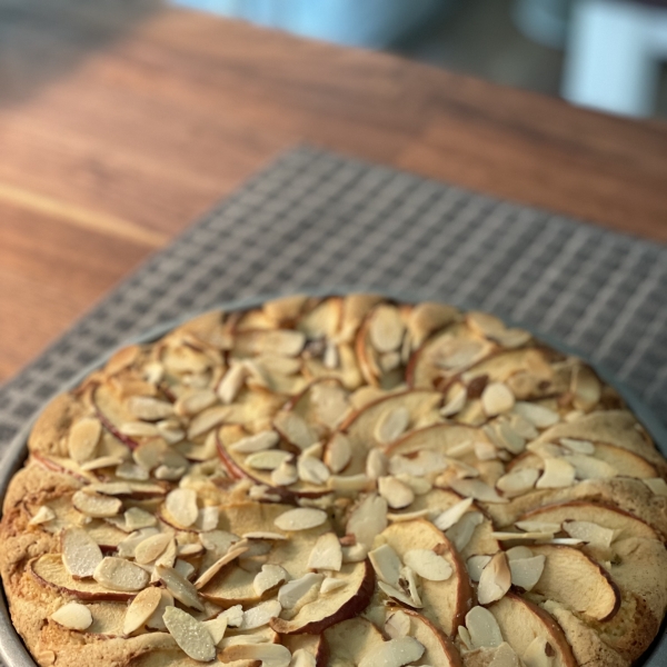 Pour batter into the prepared baking pan. Smooth the top and place apple slices in a circular pattern on batter. Sprinkle almonds and additional sugar on top.