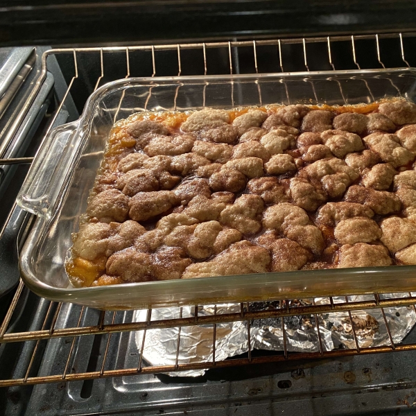 Remove peaches from oven, and drop spoonfuls of topping over them. Sprinkle entire cobbler with the sugar and cinnamon mixture. Bake until topping is golden, about 30 minutes.