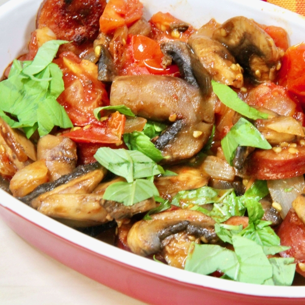 This tomato and mushroom ragout recipe is a reduction made from fresh tomatoes, mushrooms, and chopped basil for a simple, flavorful pasta sauce.
