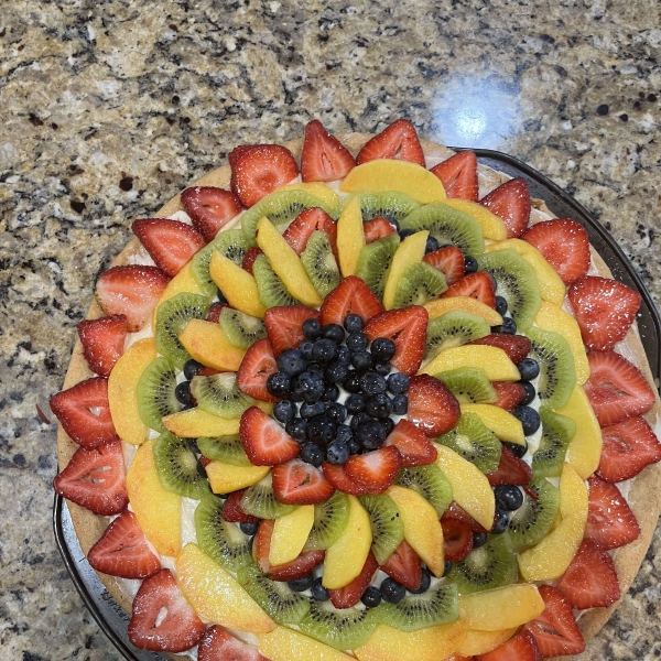 Fruit pizza is a beautiful and fun dessert perfect for a BBQ or party. Made with cookie dough, sweetened cream cheese and decorated with fresh fruit.