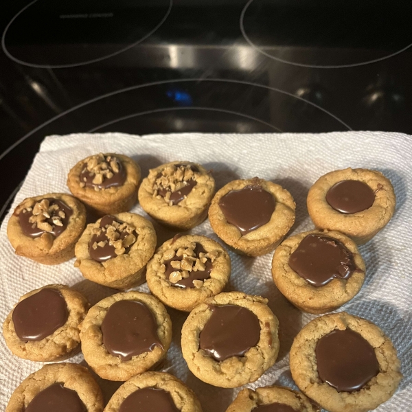 Bake in the preheated oven for 14 to 16 minutes or until lightly browned. Remove from oven and immediately make wells in the center of each using a melon baller. Cool in the pan for 5 minutes. Then carefully remove to wire racks. Using a measuring cup fill each shell with the chocolate mixture. Top with a pecan half.