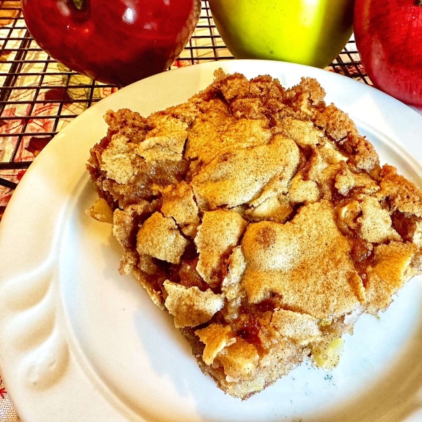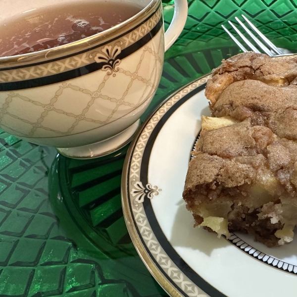 This apple cake is an easy-to-make moist, dense cake flavored with cinnamon and loaded with fresh apples, served with a dusting of powdered sugar.