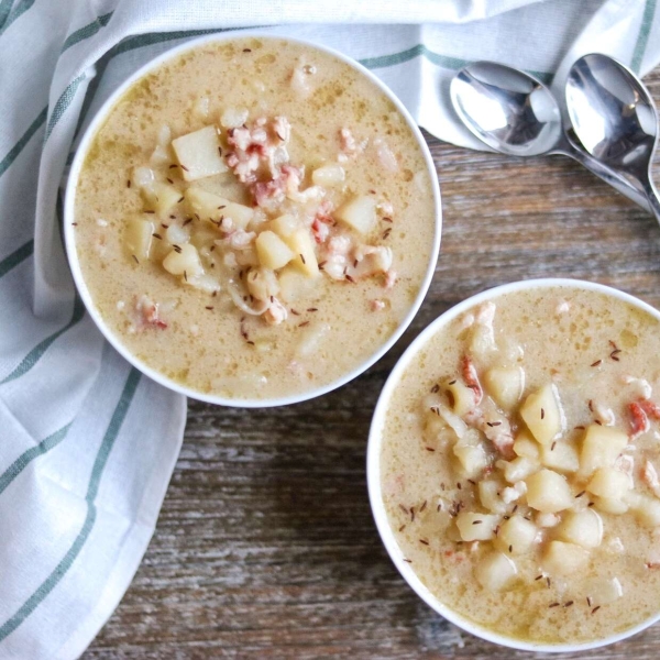 Bacon, onions, and potatoes are a classic combination utilized in this soup seasoned with caraway seed and marjoram.
